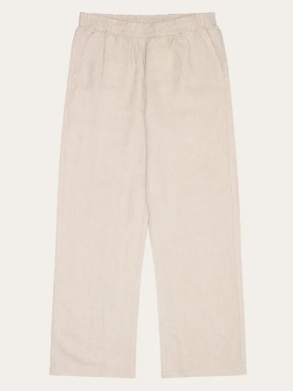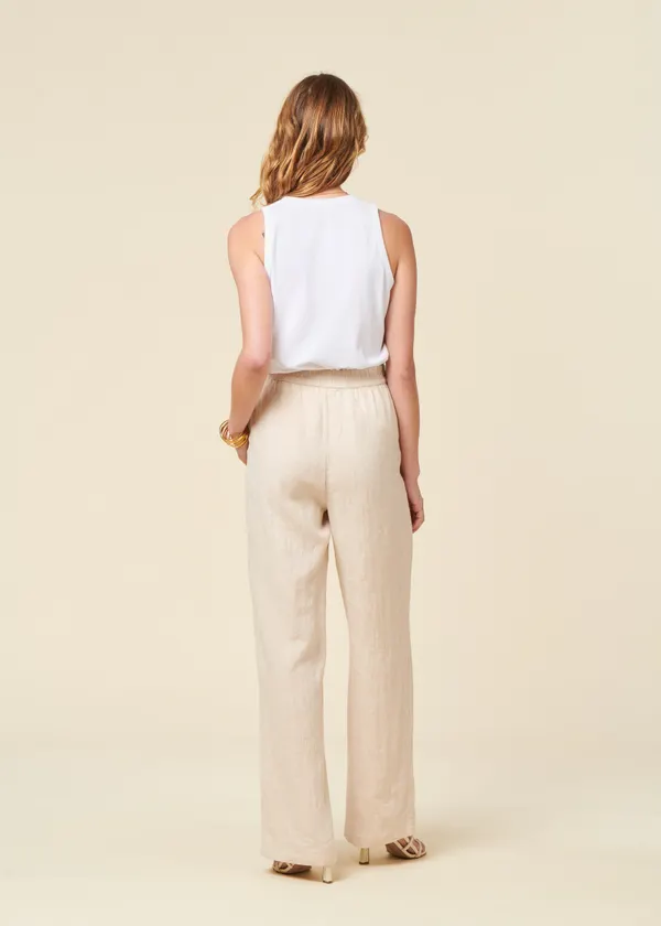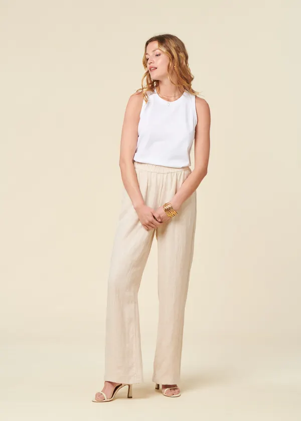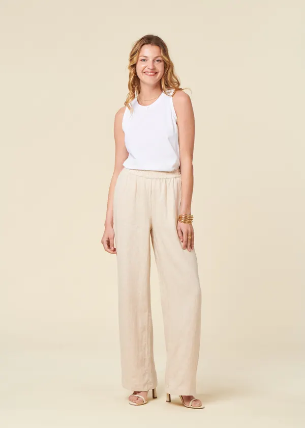 Pantalon ample en lin bio écru pour femme, coupe wide leg mi-haute, légère et aérée. Parfait pour une silhouette fluide et décontractée. Fabriqué dans un atelier européen pour un style naturel et une mode responsable.